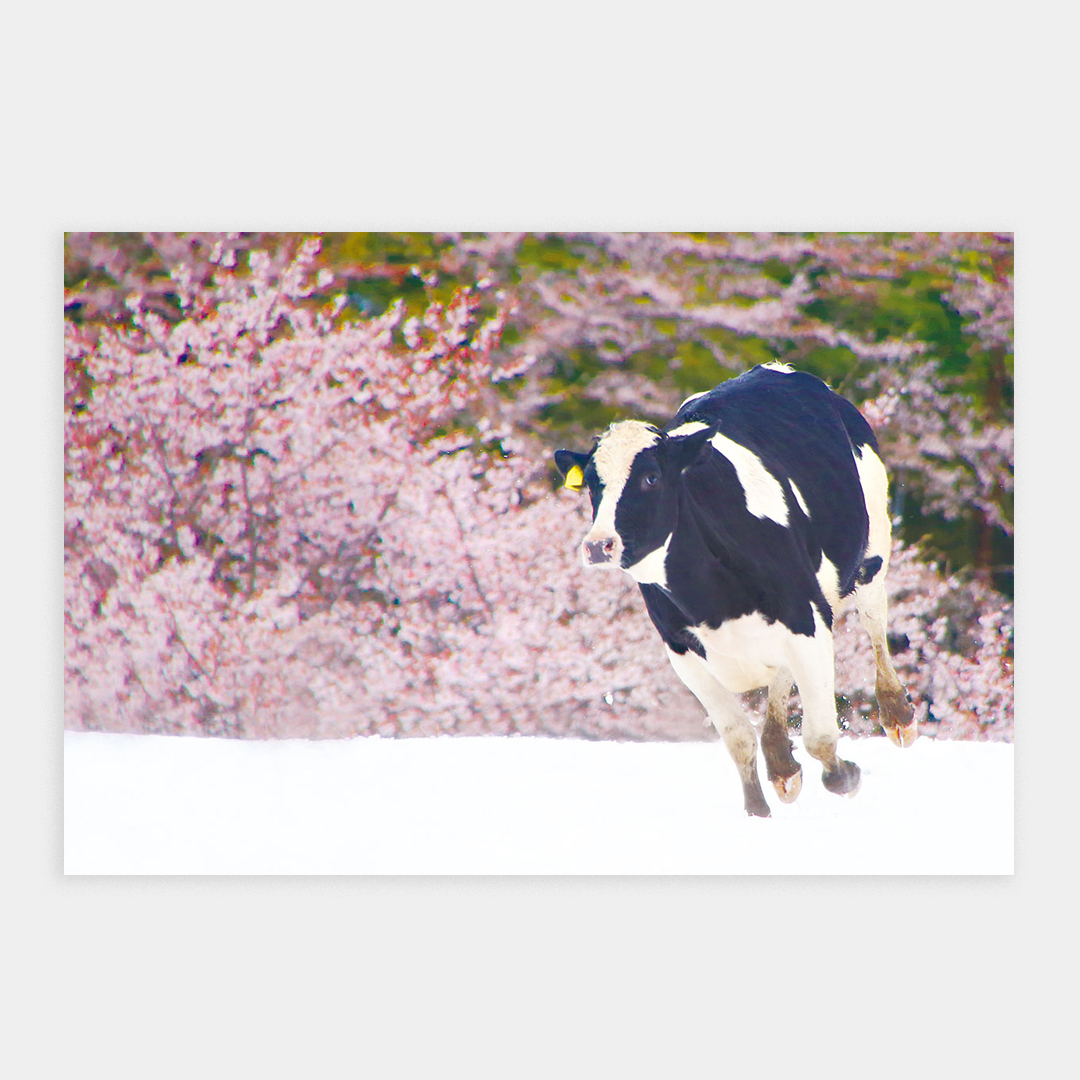 桜と雪!ホルスタイン牛が跳ねるポストカード